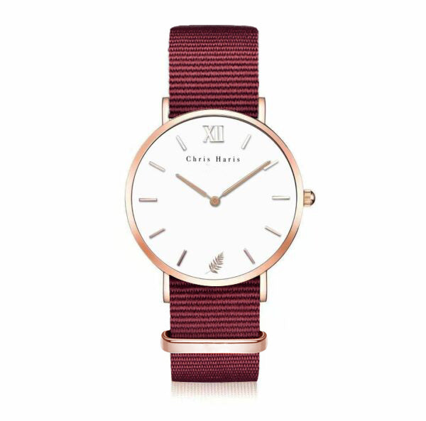 36x6mm Size, Rose Gold/White Dial, Red Wine Nato Strap, Women's Luxury Hand Watch.